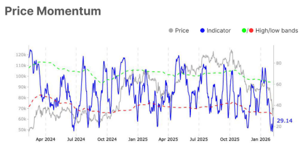 سلط تقرير جلاس نود Glassnode الأسبوعي يوم الاثنين الضوء على أن الزخم قد تحسن من مستويات التشبع البيعي العميق، حيث ارتد مؤشر القوة النسبية (RSI) لمدة 14 يومًا نحو حده الإحصائي الأدنى، مما يشير إلى تخفيف ضغط البيع وتفاعل المشترين الحذر، كما هو موضح في الرسم البياني.