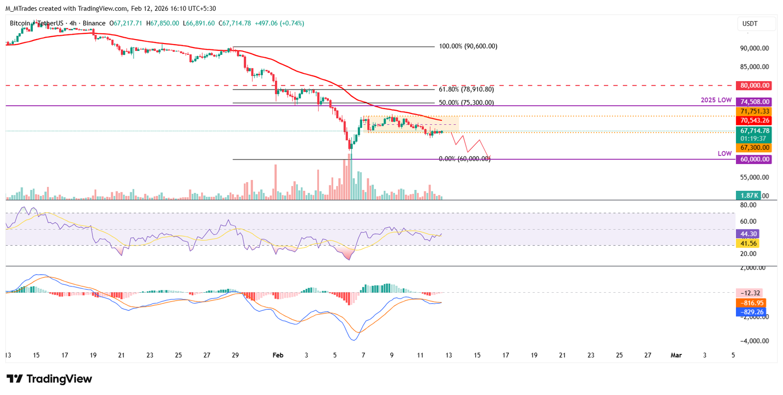 إذا تعرضت البيتكوين للرفض من الحد السفلي للتماسك عند 67300 دولار، فقد تمتد التصحيح لإعادة زيارة قاع يوم الجمعة عند 60000 دولار.