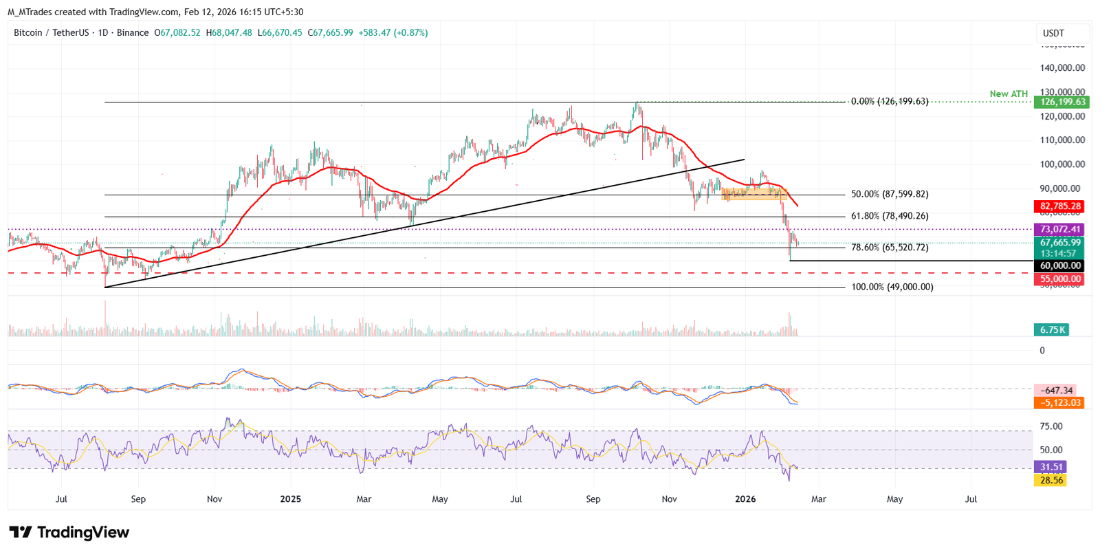 على الرسم البياني اليومي، واجهت البيتكوين رفضًا بالقرب من المقاومة اليومية عند 73072 دولار يوم الأحد وانخفضت بنحو 5% حتى يوم الأربعاء، مقتربًا من مستوى تصحيح فيبوناتشي 78.6% (الممتد من قاع أغسطس/آب 2024 عند 49000 دولار إلى القمة التاريخية التي حققها في أكتوبر/تشرين الأول 2025 عند 126199 دولار) عند 65520 دولار. في وقت كتابة هذا التقرير يوم الخميس، تتداول البيتكوين عند 67600 دولار.
