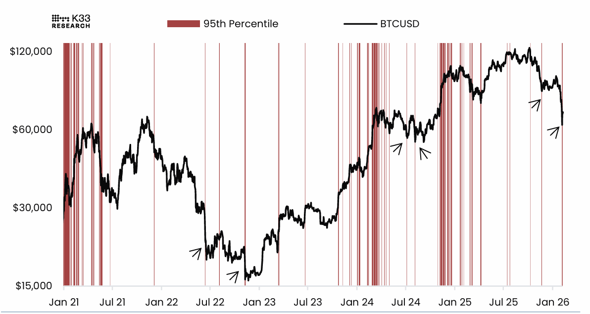 في 5 و6 فبراير/شباط، سجلت البيتكوين أيام حجم في النسبة المئوية 95 متتالية. تاريخيًا، حدث هذا مرة واحدة فقط في سوق هابطة: في 9 نوفمبر/تشرين الثاني 2022، بعد انهيار بورصة FTX. يبرز هذا المخاوف المتزايدة ورغبة كبيرة في شراء البيتكوين عند 60000-69000 دولار (سوق عرضية). ومع ذلك، تظهر التاريخ أن مثل هذه الارتفاعات في الحجم لا تضمن قاعًا فوريًا. غالبًا ما تتماسك الأسعار أو تعيد اختبار القيعان القريبة قبل أن يبدأ الانتعاش المستدام.