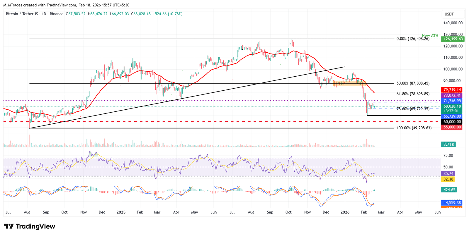 تتداول سعر البيتكوين ضمن نطاق بين 65729 دولار و71746 دولار منذ 7 فبراير/شباط. انخفضت البيتكوين بنسبة 2% حتى الآن هذا الأسبوع، واعتبارًا من يوم الأربعاء، وتتداول في محيط منطقة 68000 دولار وتقترب من الحد الأدنى من نطاق التماسك.