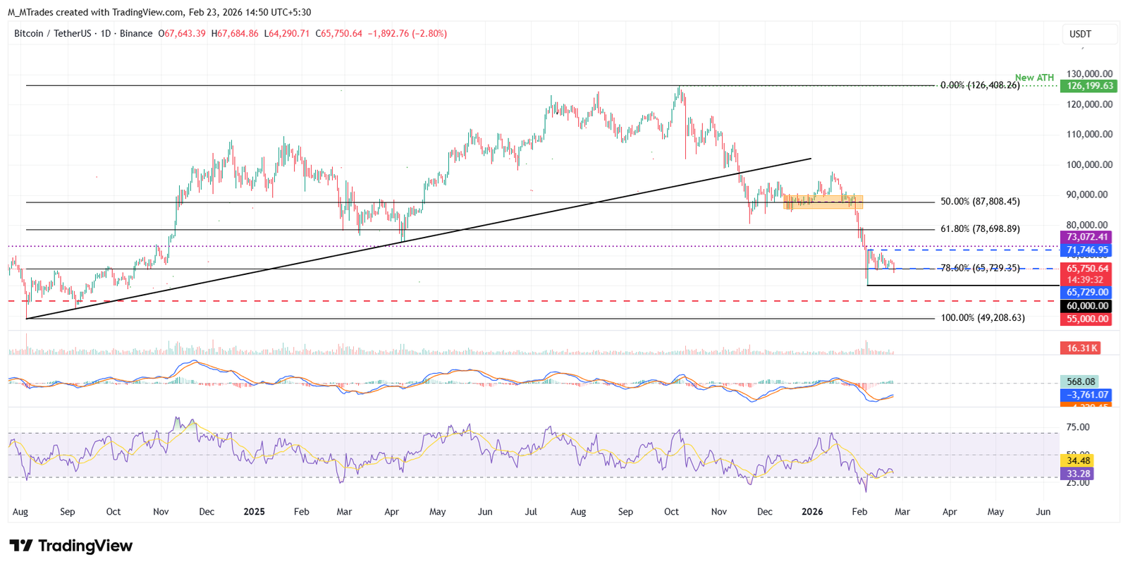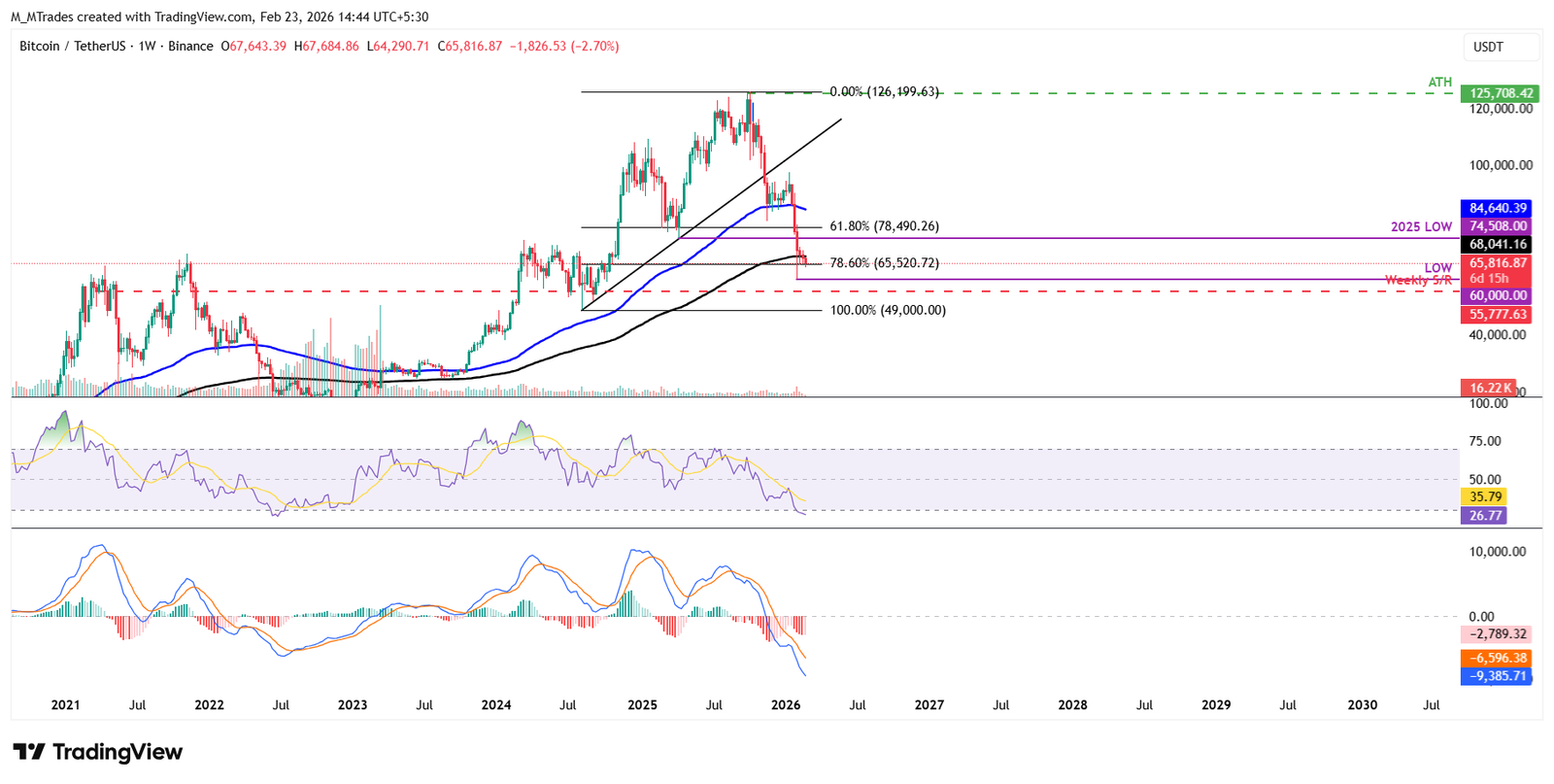 على الرسم البياني الأسبوعي، أغلق البيتكوين دون المتوسط المتحرك الأسي لمدة 200 أسبوع عند 68041 دولارًا الأسبوع الماضي. اعتبارًا من يوم الاثنين، يتداول البيتكوين بشكل أعمق، حيث يجد دعمًا عند مستوى تصحيح فيبوناتشي 78.6% (الممتد من أدنى مستوى في أغسطس/آب 2024 عند 49000 دولار إلى القمة التاريخية في أكتوبر/تشرين الأول 2025 عند 126199 دولار) عند 65520 دولارًا.