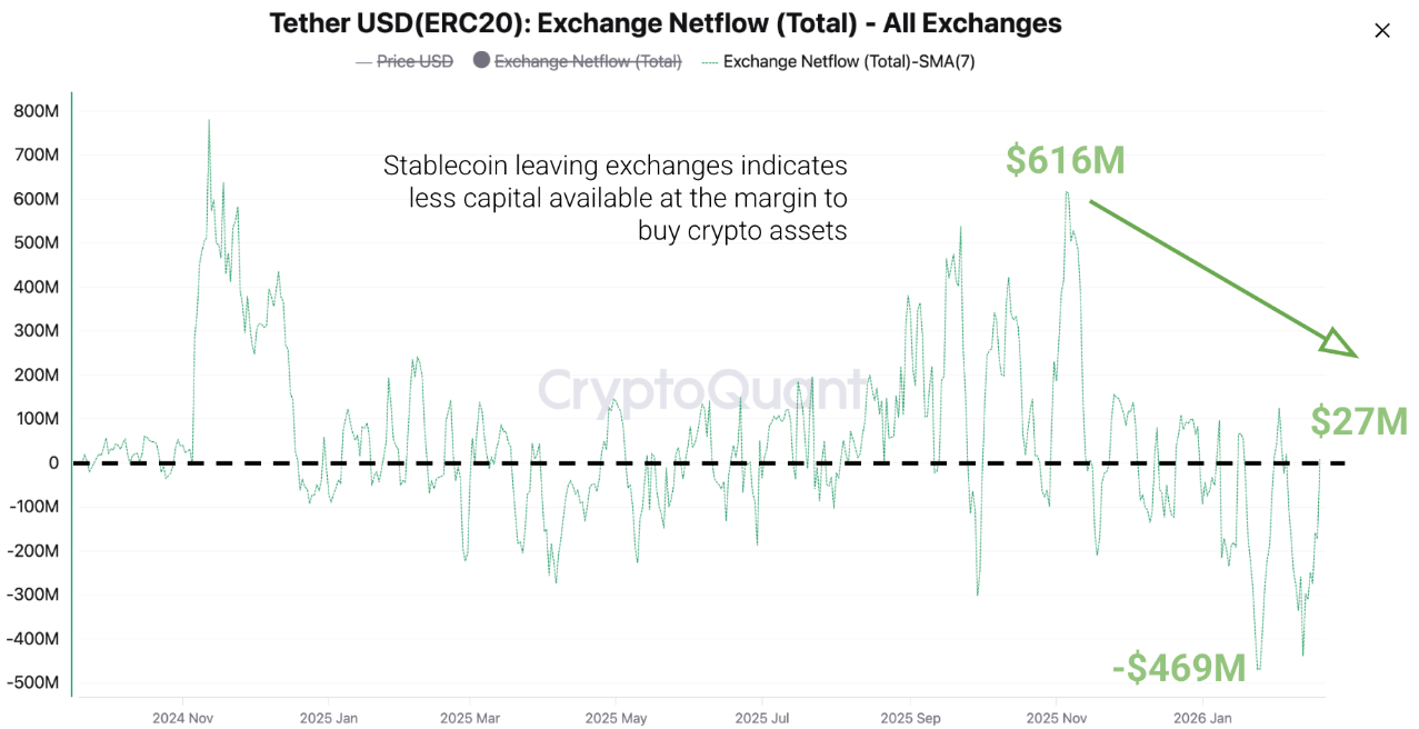 أفادت CryptoQuant يوم الجمعة أن كمية متزايدة من عملة التيثر USDT - أكبر عملة مستقرة - تغادر البورصات، مما يقلل من "البارود الجاف" لشراء الأصول المشفرة.