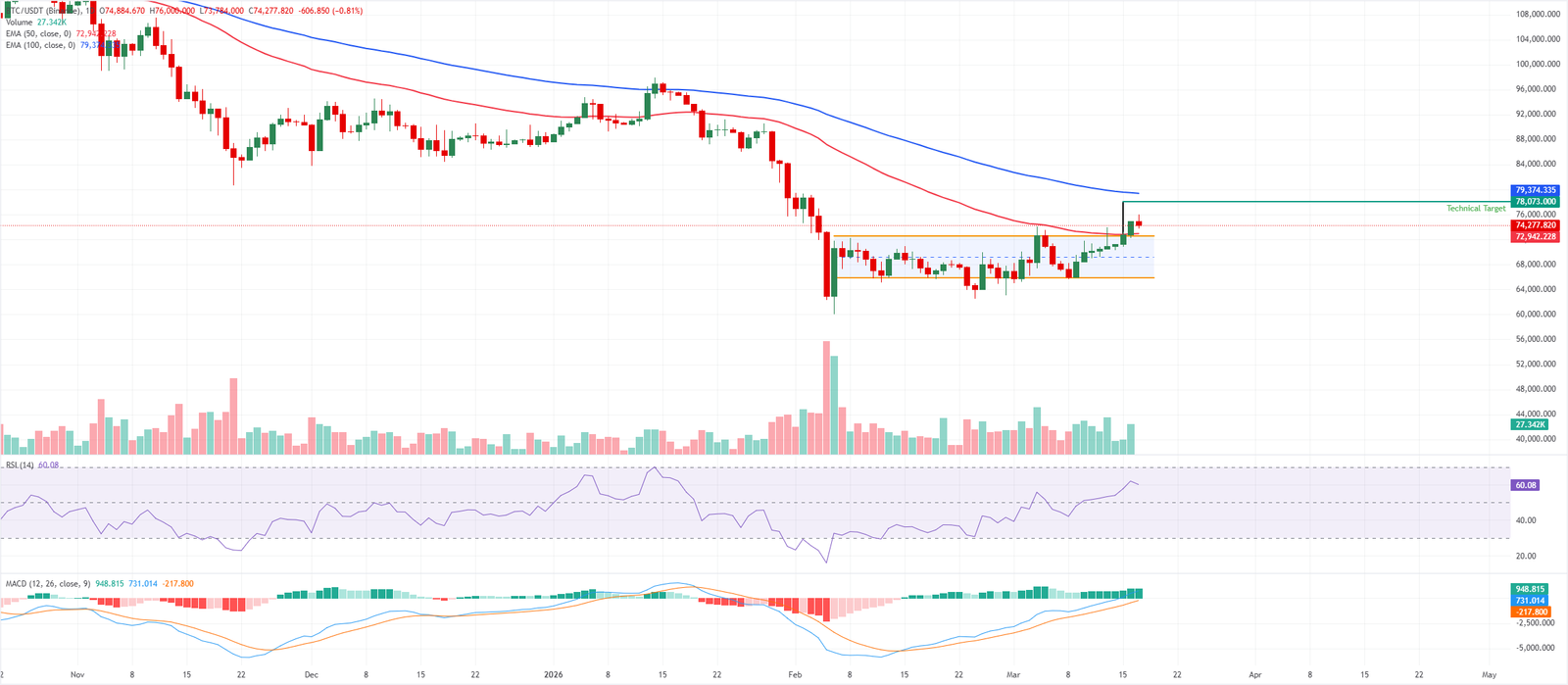 انخفضت البيتكوين (BTC) قليلاً، حيث تتداول بالقرب من 74300 دولار يوم الثلاثاء وأعادت اختبار الحد العلوي لقناة عرضية تم كسرها سابقًا. لا يزال الطلب المؤسسي وطلب الشركات قويًا وسط الحرب المستمرة في إيران، مع تسجيل صناديق الاستثمار المتداولة الفورية تدفقات، بينما أضافت شركة ستراتيجي (MSTR) 22337 بيتكوين إلى احتياطياتها يوم الاثنين. تعيد الحركة السعرية لملكة الكريبتو إحياء سردية "الملاذ الآمن الرقمي" وسط تزايد عدم اليقين.