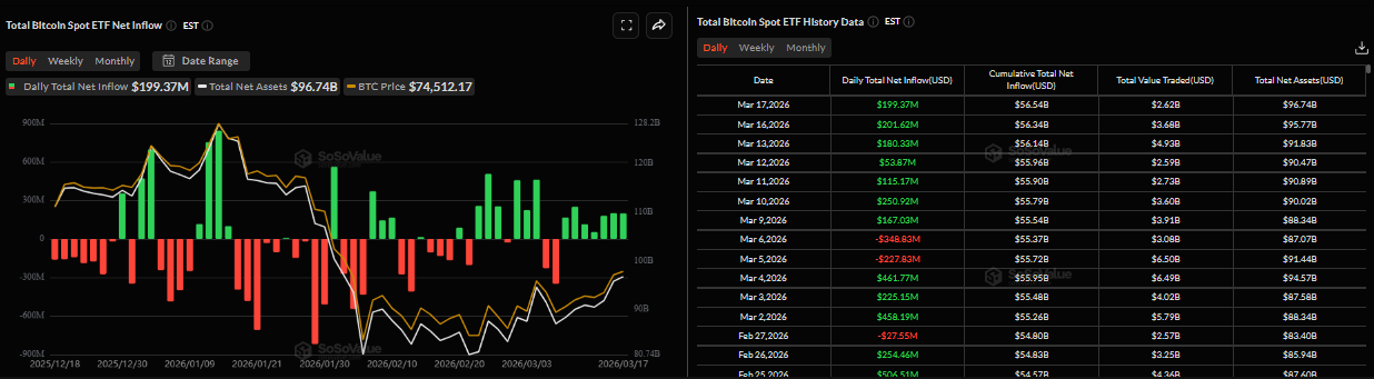 ظل الطلب المؤسسي على البيتكوين قويًا حتى الآن هذا الأسبوع. وفقًا لبيانات SoSoValue، سجلت صناديق البيتكوين الفورية تدفقات داخلية قدرها 199.37 مليون دولار يوم الثلاثاء، مما يمثل اليوم السابع على التوالي من التدفقات الإيجابية منذ 9 مارس/آذار. إذا استمرت هذه التدفقات وتكثفت، فقد يشهد البيتكوين ارتفاعًا في الأيام القادمة.