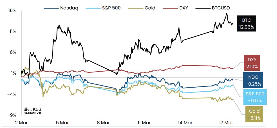 ارتفع سعر البيتكوين بنحو 13%، متفوقًا على العوائد السلبية في كل من الأسهم والذهب، كما هو موضح في الرسم البياني أدناه.