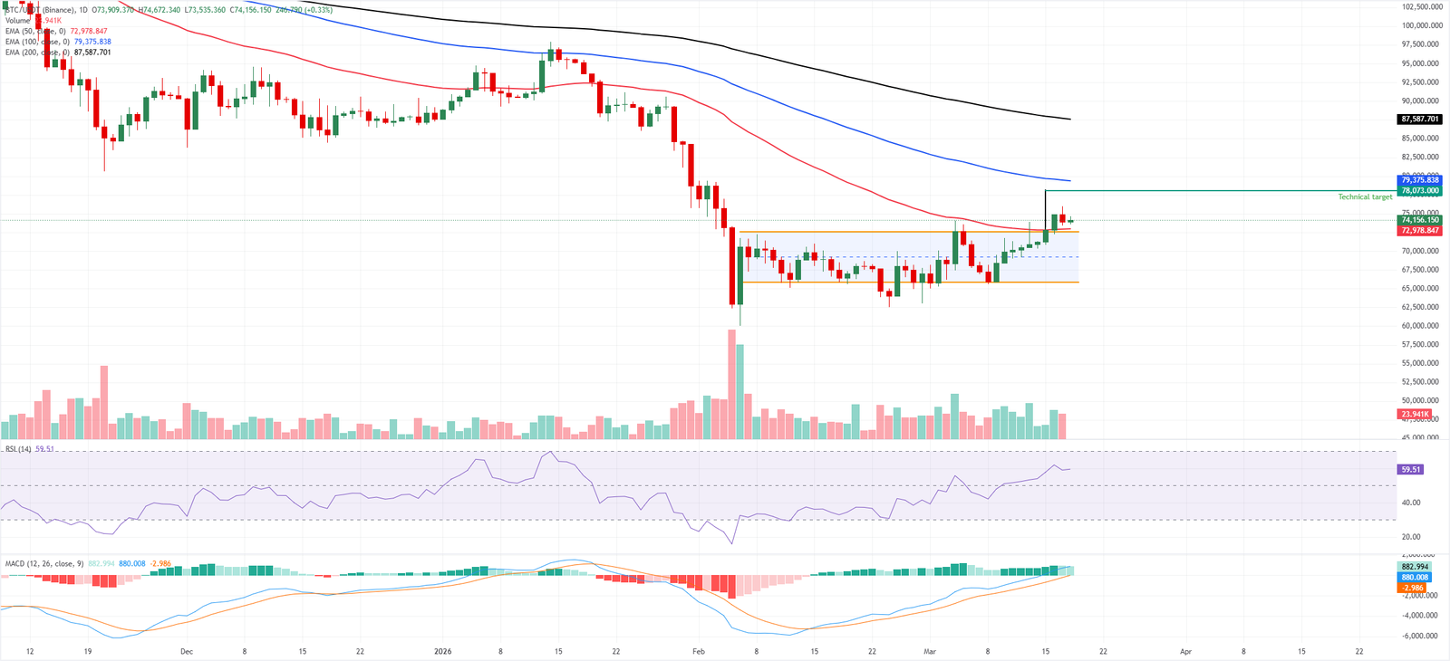 توقعات سعر البيتكوين: الهدف الفني عند 78000 دولار لا يزال قائمًا
