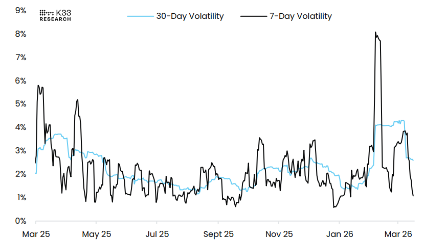يوضح الرسم البياني لتقلبات البيتكوين أدناه أن ثمانية أيام متتالية من المكاسب المتواضعة من 9 إلى 16 مارس/آذار قد دفعت تقلبات 7 أيام إلى حوالي 1%، مما يمثل أدنى مستوى لها في شهرين. تاريخيًا، يعتبر مثل هذا التسلسل نادرًا، وتشير الظروف الحالية من استقرار وانخفاض التقلب إلى تجميع منظم واحتمال استمرار الاتجاه بشكل مستدام. في المقابل، قد يشكل قرار الفيدرالي وتوقعاته في وقت لاحق من يوم الأربعاء عاملًا محفزًا رئيسيًا، قد يضخ تقلبات جديدة في الأسواق ويحدد مسار البيتكوين على المدى القريب.