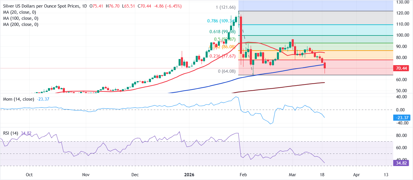 تدعم القراءات الفنية في الرسم البياني اليومي السيناريو الهبوطي، حيث يتداول زوج الفضة/الدولار XAG/USD دون متوسطه المتحرك البسيط 100 يوم لأول مرة منذ مارس/آذار 2025. يوفر المتوسط المتحرك الآن مقاومة عند حوالي 73.20 دولارًا قبل المقاومة الفورية عند تصحيح فيبوناتشي 23.6% عند 77.67 دولارًا. في الوقت نفسه، تشير المؤشرات الفنية هبوطيًا بقوة ضمن مستويات سلبية، مما يعكس قوة البائعين ويشير إلى المزيد من الانخفاضات القادمة.