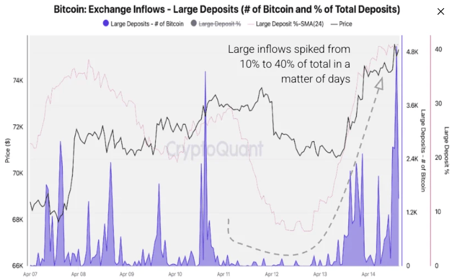 بالإضافة إلى ذلك، يُظهر الرسم البياني أدناه أن الودائع الكبيرة زادت من أقل من 10٪ إلى أكثر من 40٪ من إجمالي التدفقات إلى البورصات خلال أيام. يشير هذا الارتفاع الحاد إلى أن التوزيع من قبل المؤسسات وحاملي العملات الكبيرة هو ما يقود الارتفاع، والذي تزامن تاريخيًا مع ضغط بيع مرتفع على المدى القريب، وهو أمر يجب أن يكون المتداولون حذرين منه.