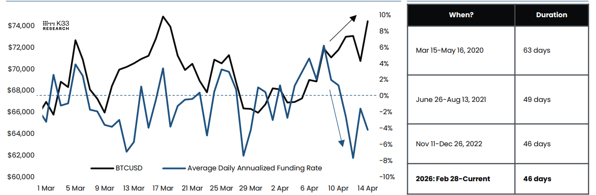 أشار محلل K33 للأبحاث إلى أنه بينما ارتفع سعر البيتكوين، ظلت معدلات التمويل سلبية إلى جانب تزايد الفائدة المفتوحة.