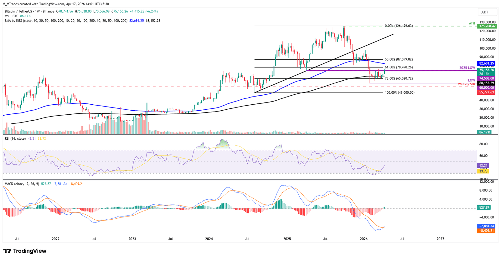 كما هو موضح في الرسم البياني الأسبوعي أدناه، ارتفع ملك العملات المشفرة بنسبة 2.47٪ وأغلق فوق المتوسط المتحرك الأسي 200 أسبوع عند 68,152 دولارًا الأسبوع الماضي. وحتى هذا الأسبوع، وسع البيتكوين مكاسبه بنسبة 6٪ حتى الآن، متداولًا فوق أدنى مستوى سنوي لعام 2025 عند 74,508 دولار يوم الجمعة.
