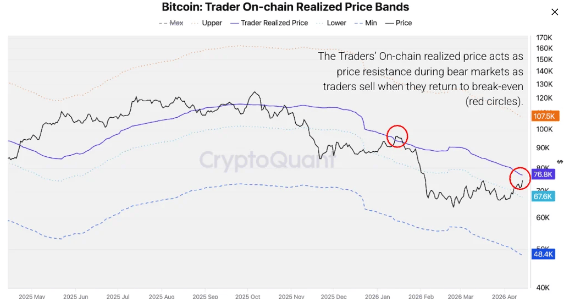 بعيدًا عن المعنويات الصعودية المذكورة أعلاه، تظهر بيانات السلسلة بعض علامات القلق. كما ورد في توقعات البيتكوين الأسبوعية السابقة، كان ملك العملات المشفرة يستهدف سعر التداول المحقق للمتداولين عند حوالي 79,000 دولار، وفقًا لتقرير CryptoQuant الأسبوعي. وحتى هذا الأسبوع، تقترب البيتكوين من منطقة المقاومة الرئيسية هذه التي، في وقت كتابة هذا التقرير، تتحرك قرابة 75000 دولار.