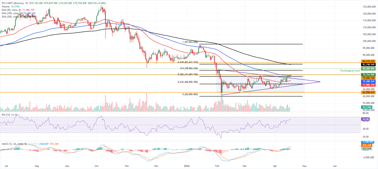 بدأت بيتكوين الأسبوع بملاحظة إيجابية، حيث يدعم تحسن معنويات السوق بسبب التطورات في الشرق الأوسط الأصول ذات المخاطر. سجلت أكبر عملة مشفرة أعلى مستوى لها خلال شهرين عند 76038 دولار يوم الثلاثاء. ثم تراجعت واستقرت قرب 74800 دولار في اليوم التالي.
