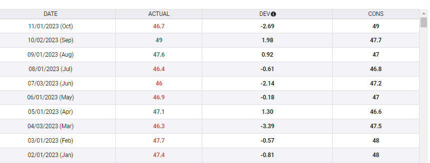 وتحتاج الأسواق إلى أن تظل الأمور على هذا النحو مما يشير إلى نمو متواضع. تقف التوقعات عند زيادة من 46.7 نقطة مخيبة للآمال الشهر الماضي إلى 47.6 هذه المرة. في الأشهر العشرة الماضية من عام 2023، انخفض المؤشر عن التقديرات سبع مرات - مما يعني خطأ آخر هذه المرة.