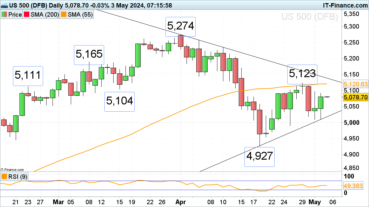 يبدو أن مؤشر S&P 500 قد وجد دعما عند أدنى مستوى له هذا الأسبوع عند 5009 وقد تم تعزيزه من خلال أرباح Apple التي تم التغلب عليها مع عودتها نحو أعلى مستوى الأسبوع الماضي ، والمتوسط المتحرك البسيط لمدة 55 يوما (SMA) وخط الاتجاه الهبوطي من أبريل إلى مايو عند 5120 إلى 5138 قبل إصدار بيانات NFP يوم الجمعة.