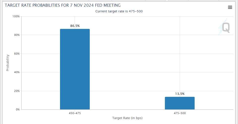 تقوم أسواق السندات حاليًا بتسعير احتمالية كبيرة لخفض صغير للفائدة بمقدار 25 نقطة أساس في الاجتماع المقبل لمجلس الاحتياطي الفيدرالي في نوفمبر/تشرين الثاني.