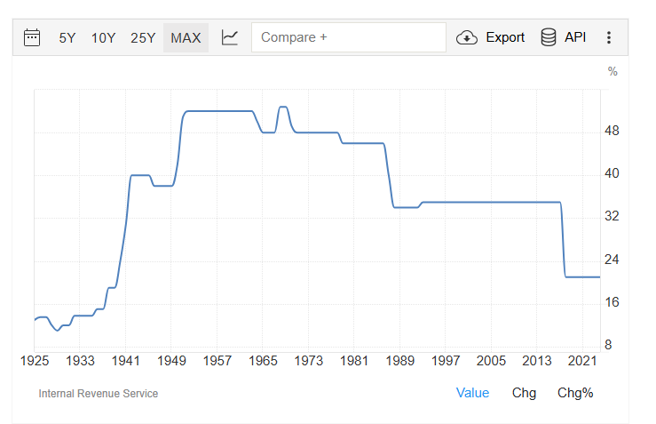 خفض ترامب الضرائب على الشركات في عام 2018، وحددها عند 21%، وهو أدنى مستوى منذ الحرب العالمية الثانية: