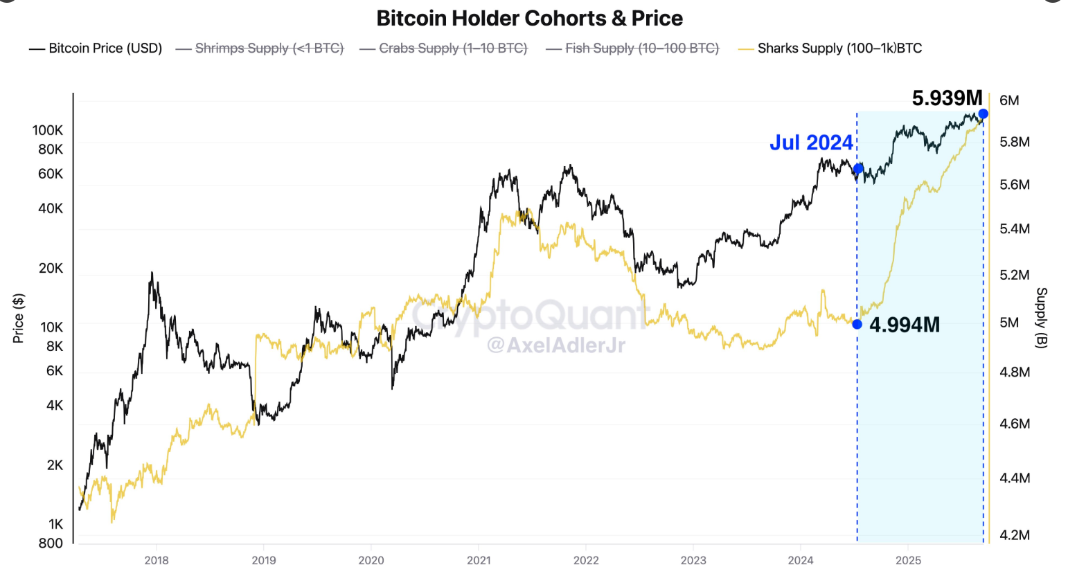 تشير بيانات كريبتو كوانت CryptoQuant إلى أنه منذ يوليو/تموز 2024، قامت محافظ القروش (التي تحتفظ بين 100 و1,000 بيتكوين) بتجميع ما يقرب من مليون بيتكوين، مما رفع رصيدها الإجمالي إلى حوالي 5.9 مليون بيتكوين، مما يبرز الثقة المتزايدة بين المستثمرين من الحجم المتوسط.