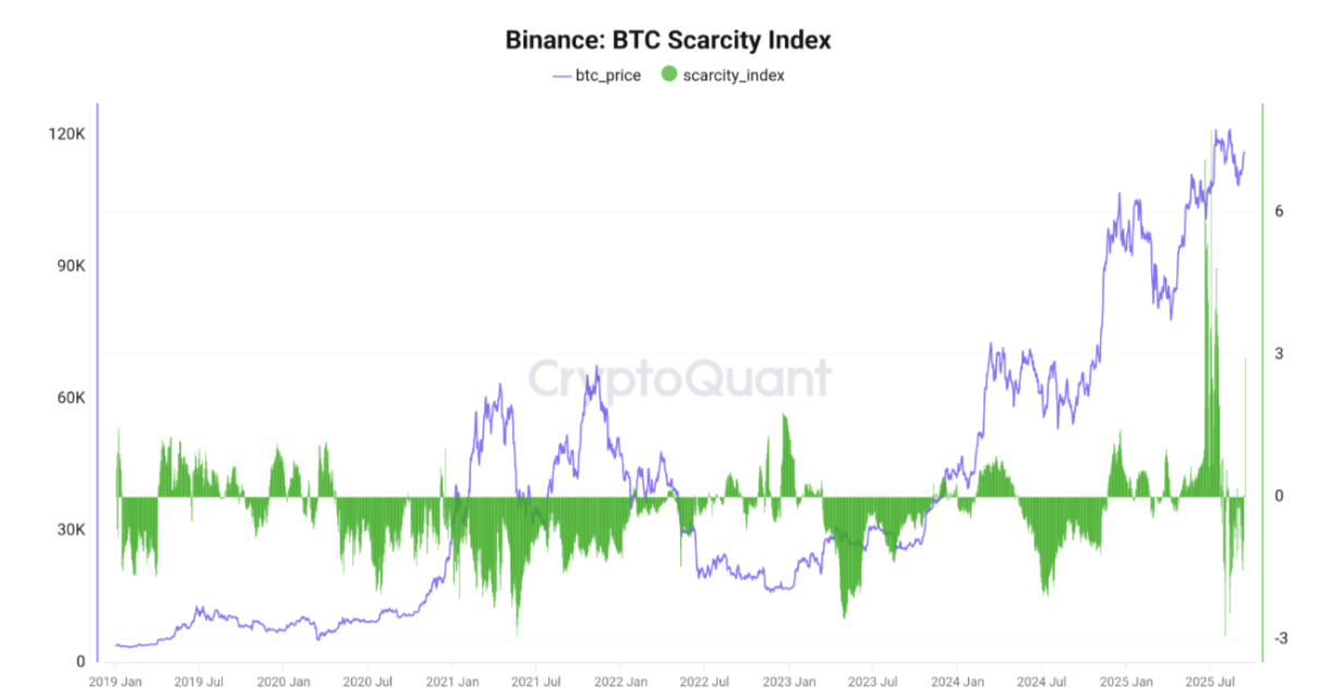 تظهر بيانات كريبتو كوانت أن مؤشر ندرة البيتكوين على منصة بينانس شهد ارتفاعًا إيجابيًا مفاجئًا يوم الأحد، مما يمثل المرة الأولى منذ يونيو/حزيران الماضي. غالبًا ما يعني الارتفاع المفاجئ أن كمية كبيرة من البيتكوين قد تم سحبها من المنصة أو أن أوامر البيع انخفضت بشكل كبير، مما يجعل العرض المتاح نادرًا فجأة. تاريخيًا، عندما يرتفع هذا المؤشر ويظل إيجابيًا لعدة أيام متتالية، فإن سعر البيتكوين قد ارتفع بشكل حاد، كما حدث في يونيو، عندما ارتفع سعر البيتكوين نحو 120,000 دولار للمرة الأولى.