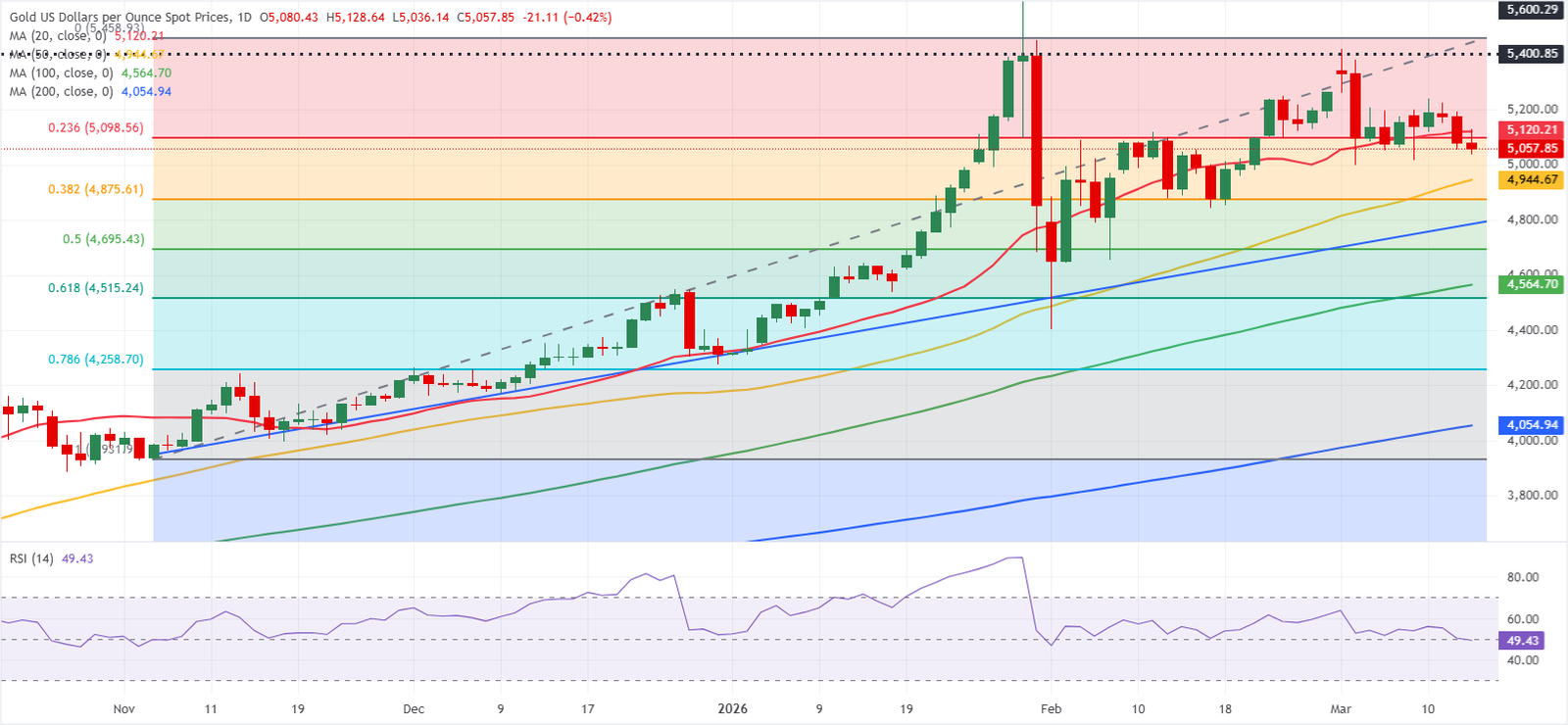 تشكل مستويات تصحيح فيبوناتشي 23.6% للاتجاه الصاعد من نوفمبر/تشرين الثاني إلى فبراير/شباط والمتوسط المتحرك البسيط لمدة 20 يومًا منطقة محورية عند 5100-5120 دولار. في حال بقي الذهب دون هذه المنطقة وأكدها كمقاومة، قد يبقى المشترون على الهامش. بالنظر إلى الاتجاه الهابط، يمكن تحديد أول مستوى دعم عند 4945 دولار (المتوسط المتحرك البسيط لمدة 50 يومًا)، يليه 4875 دولار (تصحيح فيبوناتشي 38.2%) وخط الاتجاه الصاعد عند 4800 دولار.